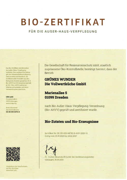 Deshalb haben wir im September 2004 das GRÜNE WUNDER Die Vollwertküche GmbH gegründet. Seitdem kochen wir täglich für kleine und große Kinder (und auch für die ganz Großen) eine frische, vollwertige und leckere Mittagsmahlzeit. Die dabei verwendeten Zutaten stammen von ausgesuchten Erzeugern und aus überwiegend ökologischem Anbau.